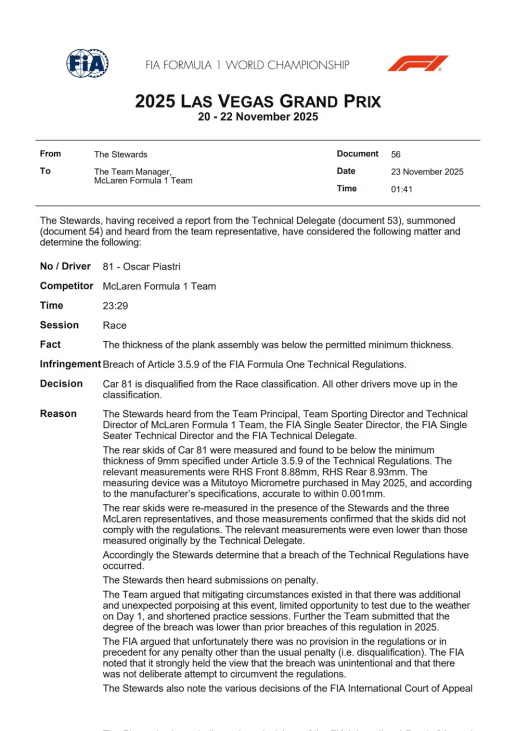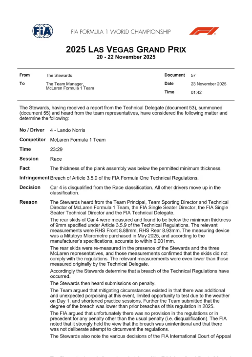 La sanción se originó cuando los delegados técnicos de la FIA detectaron que el desgaste de los patines de resina —ubicados en la parte inferior de los McLaren MCL39— era inferior al mínimo reglamentario de nueve milímetros, tal como exige el artículo 3.5.9 del Reglamento Técnico. Las mediciones, realizadas con un micrómetro de alta precisión, arrojaron valores de 8,88 mm y 8,93 mm en el coche de Norris, cifras que se confirmaron en presencia de los comisarios y representantes del equipo. El informe oficial de la FIA, citado por Formula1.com, especificó: “Los patines traseros se volvieron a medir en presencia de los Comisarios y los tres representantes de McLaren, y dichas mediciones confirmaron que no cumplían con el reglamento. Las mediciones relevantes fueron incluso inferiores a las obtenidas originalmente por el delegado técnico”.