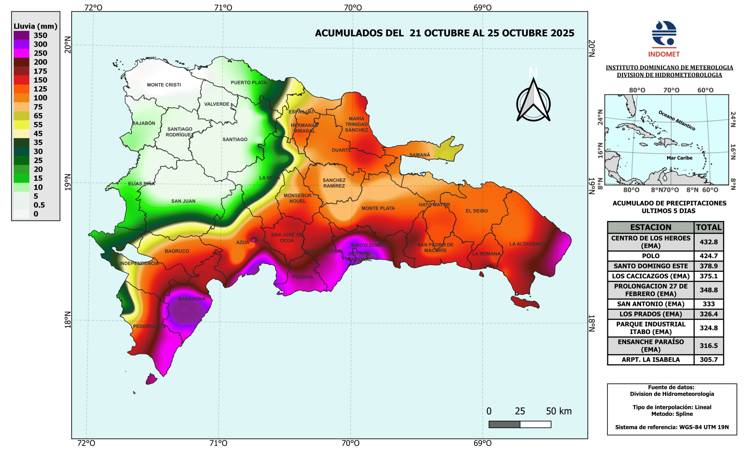 De acuerdo con el mapa pluviométrico correspondiente al período del martes 21 al sábado 25 de octubre de 2025, las zonas con mayores precipitaciones fueron Santo Domingo y Barahona, donde los acumulados superaron los 400 milímetros de lluvia, lo que equivale a 17 pulgadas.